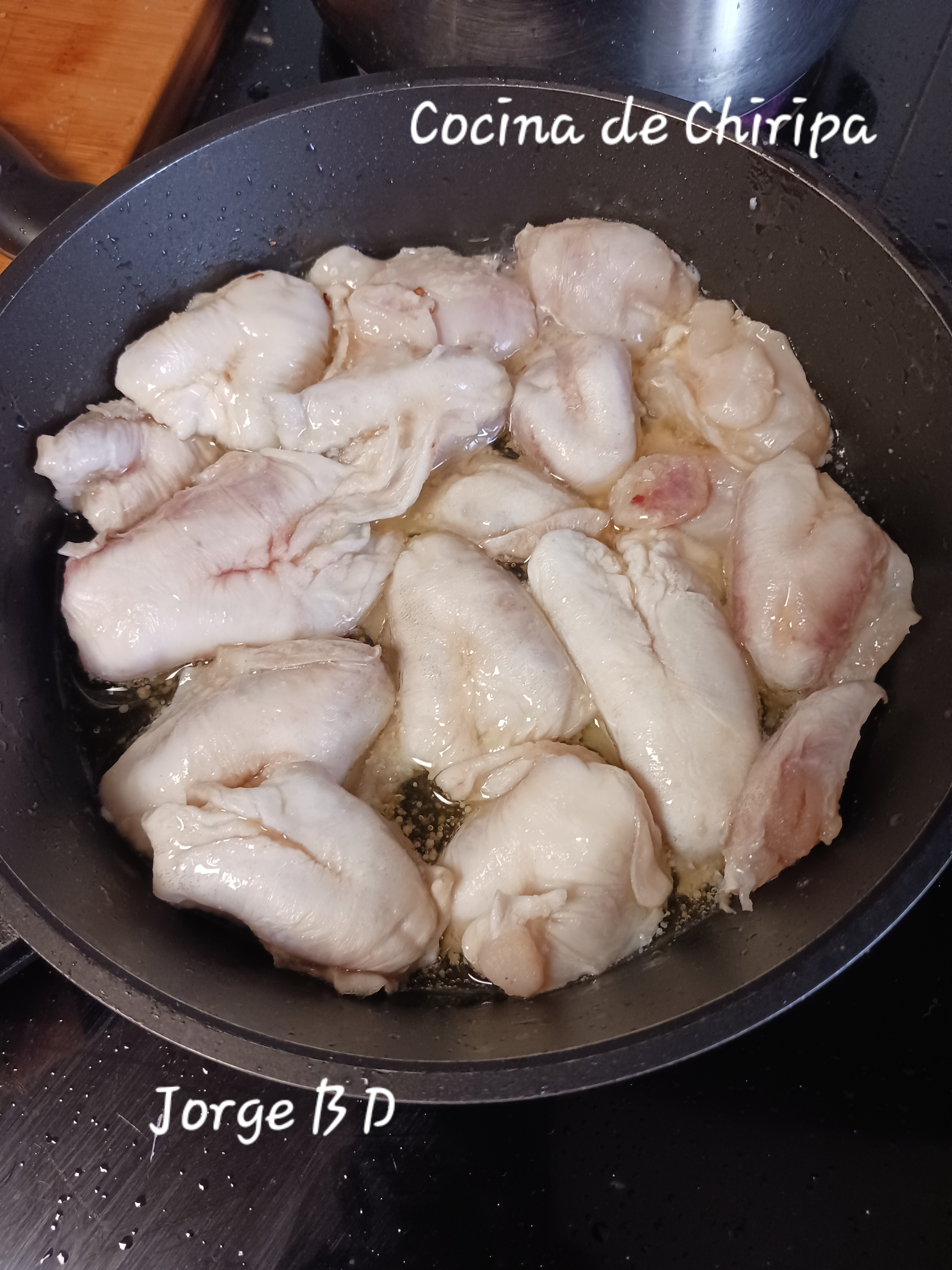 En ese mismo aceite y a fuego medio, meto las kokotxas y las muevo suavemente paras que suelte su gelatina.